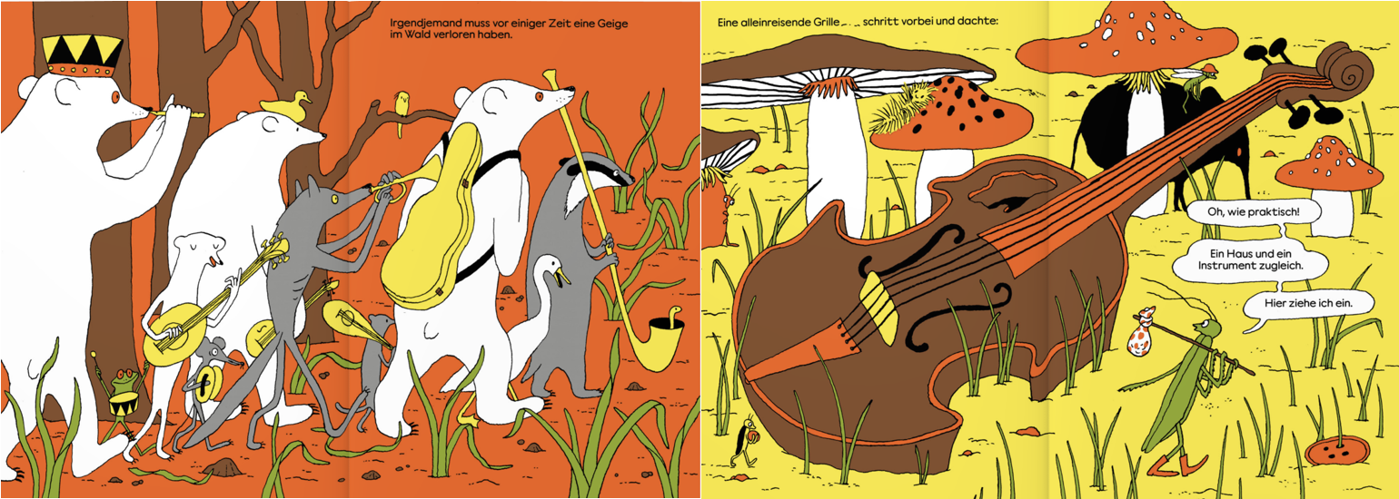 One summer, a wandering cricket finds an old violin in the woods. “How convenient!”, she exclaims and promptly uses the spacious instrument as her new home. At nighttime, she plays the violin’s strings with her arms and legs which delights all small animals around, even the moths in the pumpkin-bar. As the year comes to an end however, a bitter-cold winter begins that will put the cricket’s music and the solidarity of the wood-dwellers to a hard test.